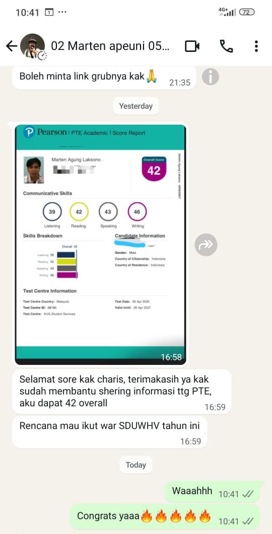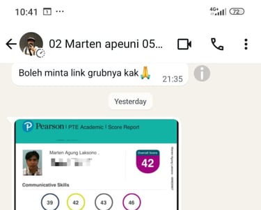 Thanks ya coach sudah ngajarin banyak trick dan tips, yang awalnya aku bingung mau ambil PTE atau IELTS dan aku stuck di kedua pilihan ini, dan aku sudah hampir payment buat private course IELTS karena tutor kmrn bilang aku harus di gembleng lagi di writing, aku kacau dan hampir mau nyerah. Baiknya tuhan, datangkan teman online ku anak LT 1, ngasih tahu tentang ikut LT se ngefek itu, di ajarin dia pte itu gmn secara singkat, dipinjemin account apeuninya dan dijelasin gurully tuh gimana dan Dari situ aku kabur dr IELTS ke PTE dan join LT ini, dr yg awalnya aku gatau PTE cuma liat sekilas di sosmed doang.
